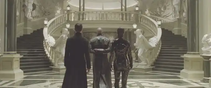 Архитектор и сцена его кабинета — одна из наиболее нагруженных отсылками частей фильма. Белая комната, симметричные мониторы и сухой, аналитический тон диалога строят явную аллюзию на математический, детерминистский взгляд на мир. Архитектор выступает как персонификация логики системы, а множество экранов с разными вариантами выбора и взаимодействий напоминают о теории вероятностей, моделировании и кибернетике. Эта сцена отсылает не только к классическим научно-философским дискуссиям о свободе воли и предопределённости, но и к богатой традиции литературных «гениев-архитекторов» от классики до модернизма, где архитектура пространства является метафорой для устройства мира.