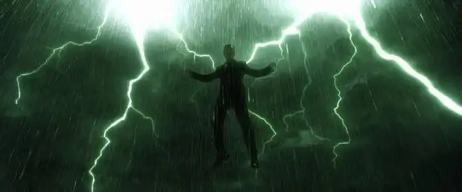 Финальная сцена в Матрице разворачивается возле центрального узла, где дождь, молнии и мрачная архитектура подчёркивают театральность момента. Смит нападает и словно побеждает Нео: он копирует на него свою сущность, поглощая его физически в виртуальном пространстве. Но именно эта ассимиляция становится ключом к победе. Машины, подключенные к телу Нео в реальном мире, посылают мощный электрический импульс через его тело и соединение с Матрицей. Поступок Нео — сознательная жертва: позволив Смиту поглотить себя, он стал проводником машины-уничтожителя вируса, и через его тело производится «перезагрузка», уничтожающая Смита и все его копии. Результат — гибель Нео: его тело перестаёт подавать признаки жизни, и его, уносят машины. В этот момент завершается цикл разрушения и восстановления: вирус Смит уничтожен, Матрица очищена, но цена — жизнь спасителя.